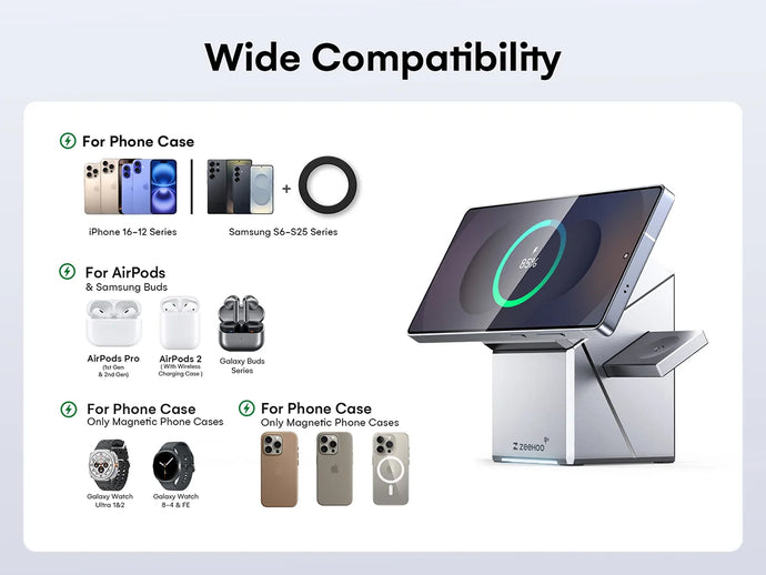 Compatible with Apple iPhone 12–16 series and Samsung S6–S25 series (also supports any wireless charging-enabled phone, but magnetic alignment requires a MagSafe-compatible or magnetic case), wireless charging-enabled earbuds, and Samsung smartwatches. And the latest versions of each device.