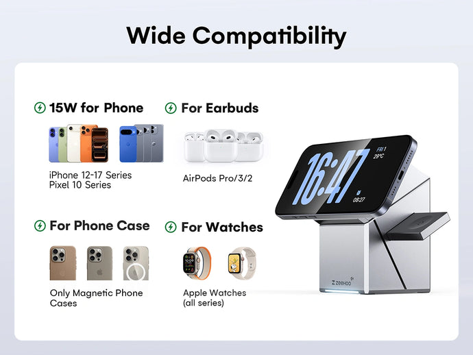 - Compatibility: Compatible with iPhone 12–17 series and MagSafe cases, Apple Watch 4–9, and AirPods 2–4 Pro. And the latest versions of each device. (Also supports any wireless charging-enabled phone, but magnetic alignment requires a MagSafe or magnetic case.)