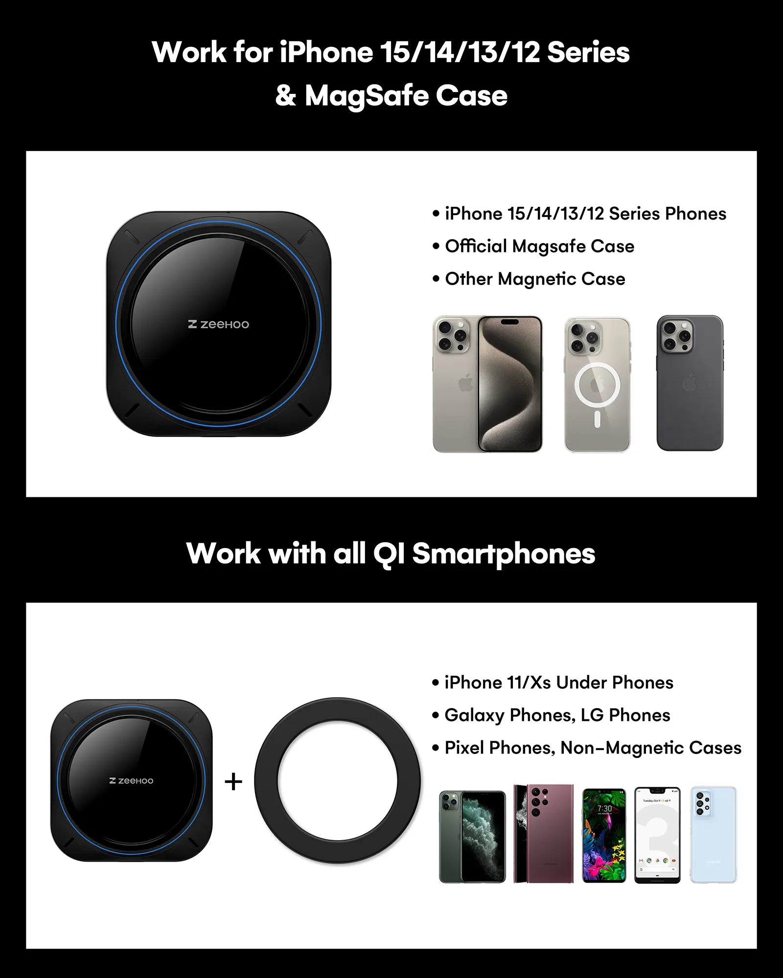 The magnet is designed specifically for iPhone 12 to 16 series, but it also comes with magnetic rings that can be attached to other phones. This lets you enjoy magnetic charging even if your phone doesn't have it built in.