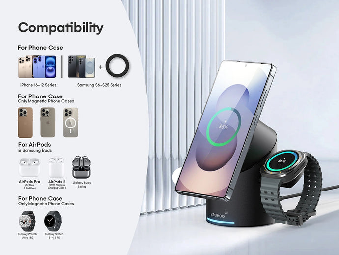 Compatible with Apple iPhone 12–16 series and Samsung S6–S25 series (also supports any wireless charging-enabled phone, but magnetic alignment requires a MagSafe-compatible or magnetic case), wireless charging-enabled earbuds, and Samsung smartwatches. And the latest versions of each device.