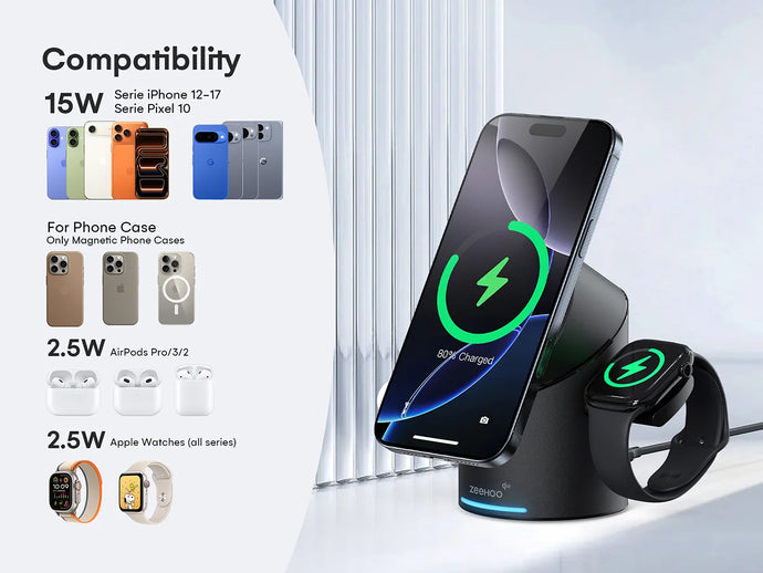 - Compatibility: Compatible with iPhone 12–17 series and MagSafe cases, Apple Watch 4–9, and AirPods 2–4 Pro. And the latest versions of each device. (Also supports any wireless charging-enabled phone, but magnetic alignment requires a MagSafe or magnetic case.)